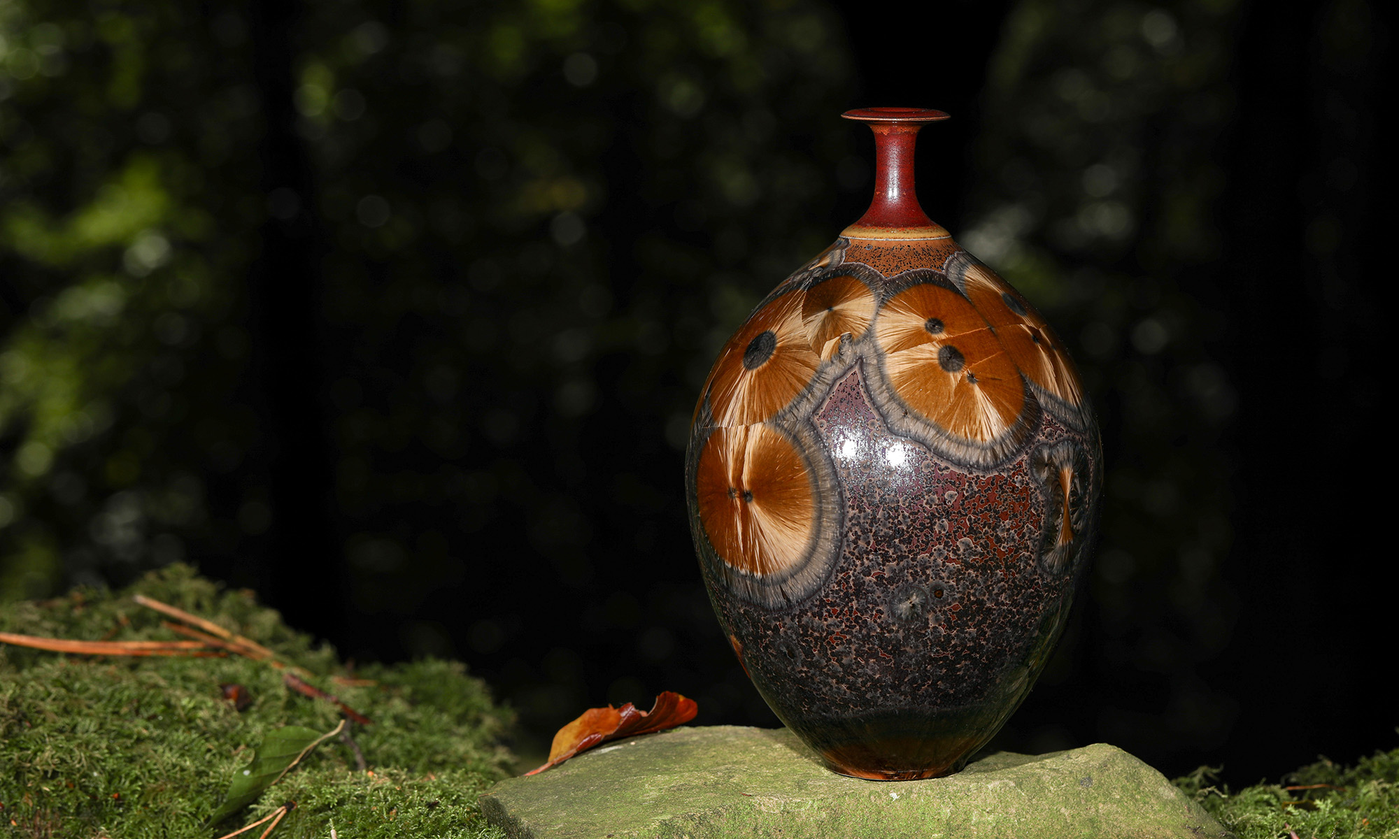 Two aspects of the versatile role of iron are shown on this piece. Iron red on the neck and iron gold on the body – changes that occur in the different chemistries of the glazes.